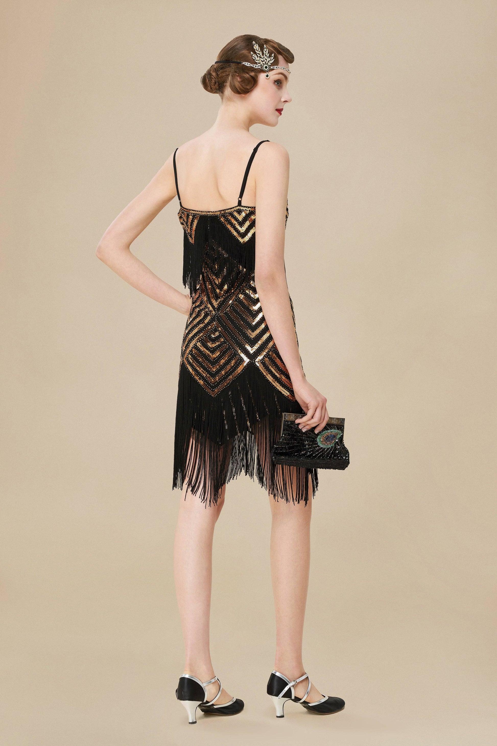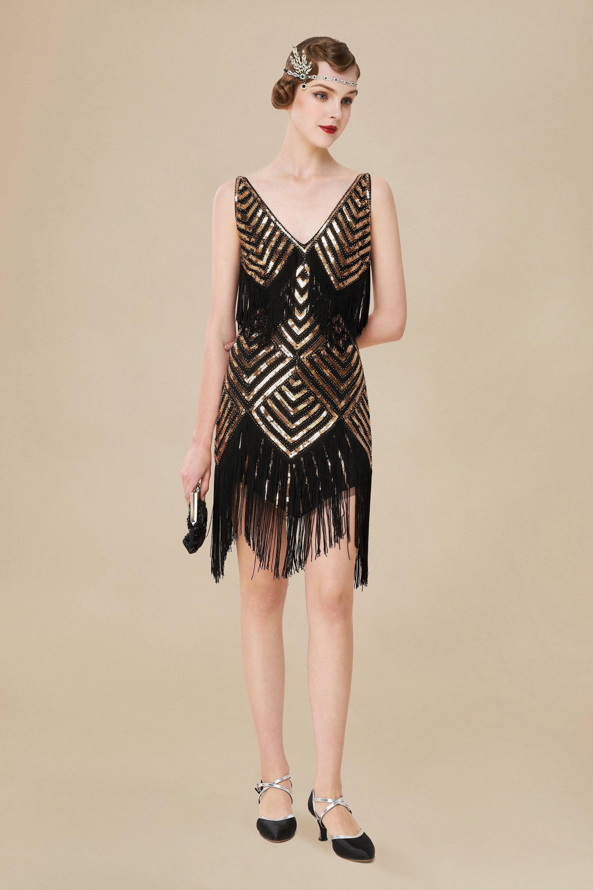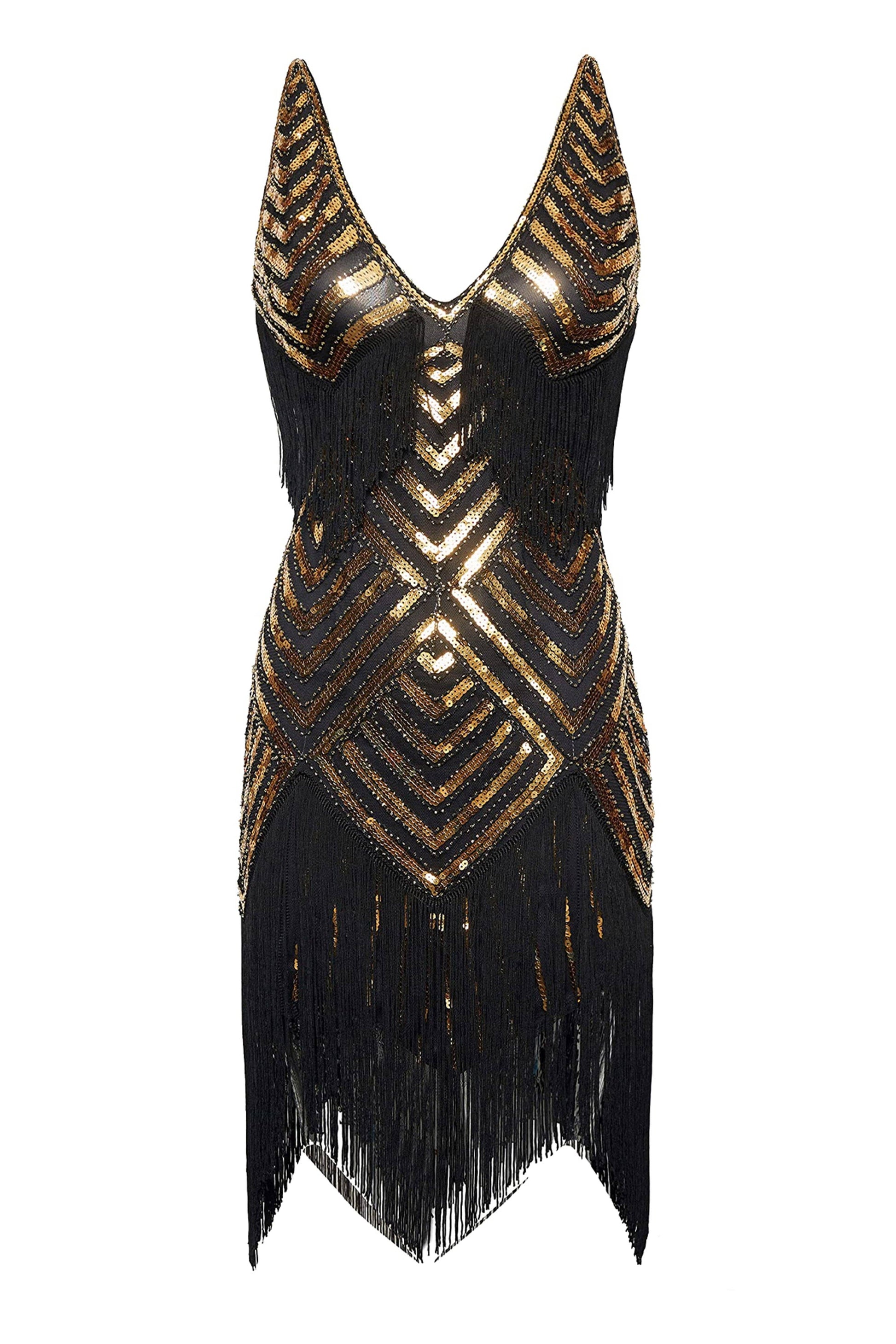 This elegant dress is classic vintage look for a modern woman. The eye-catching design features art deco print and unique vintage style which bring you back to the roaring twenties. Features: * Deep v-neck design * Backless design * Side zipper closure * A dazzling array of beads and sequins Note: This dress comes with an unique size chart. Be sure to select your ideal fit from the chart before making your purchase.