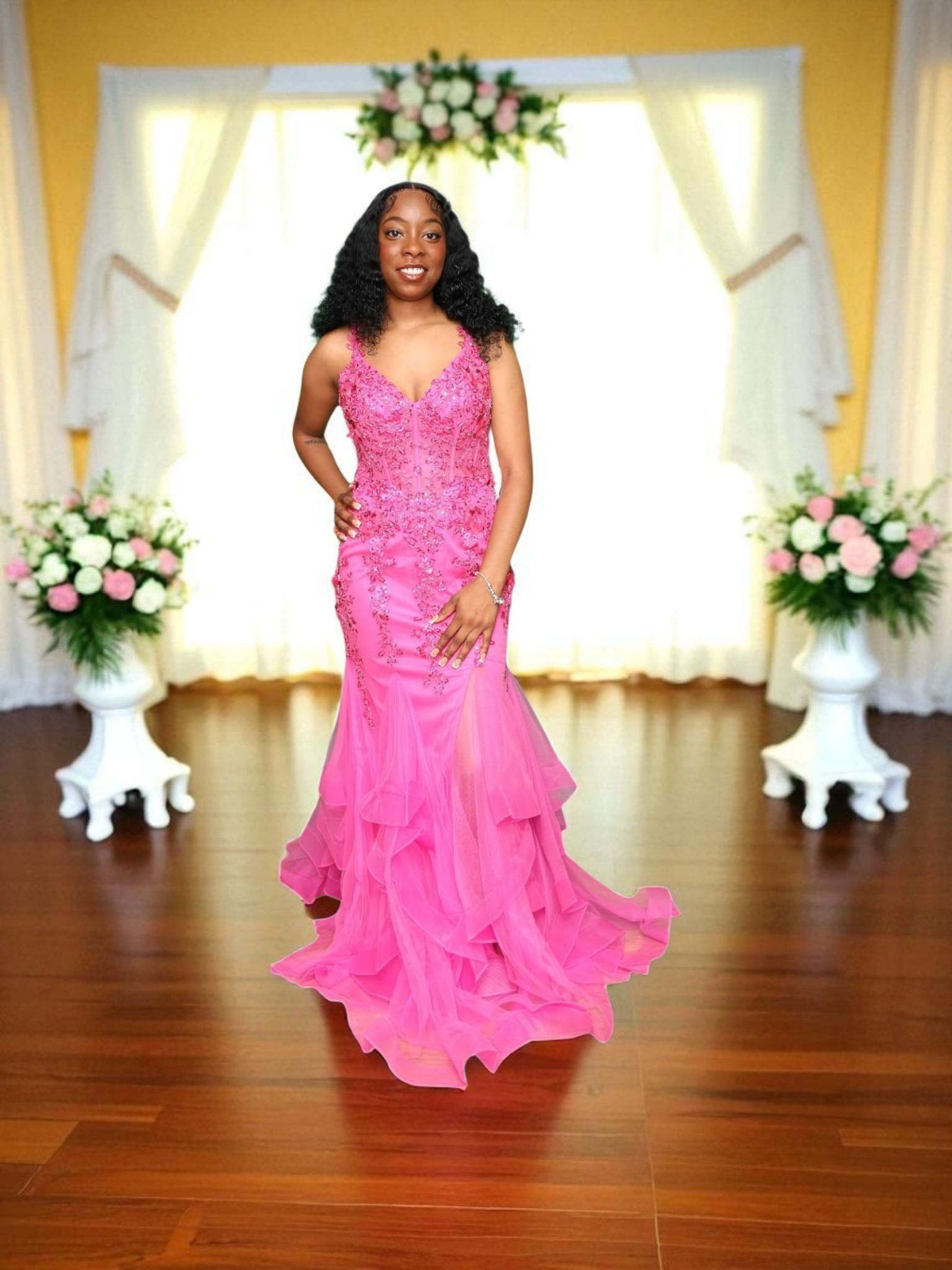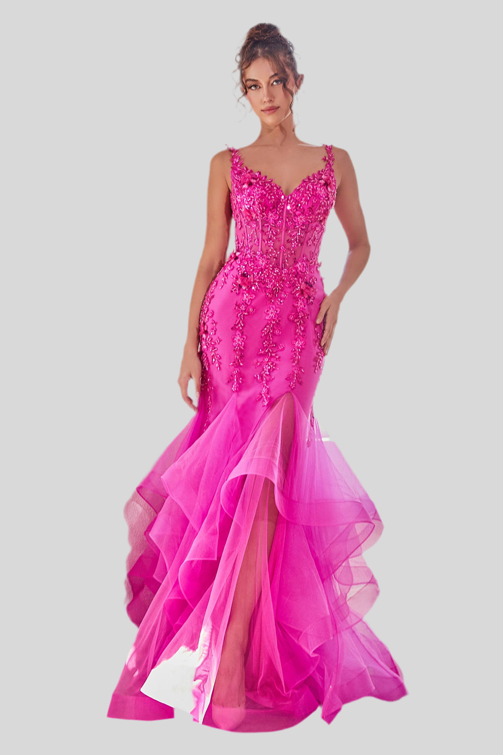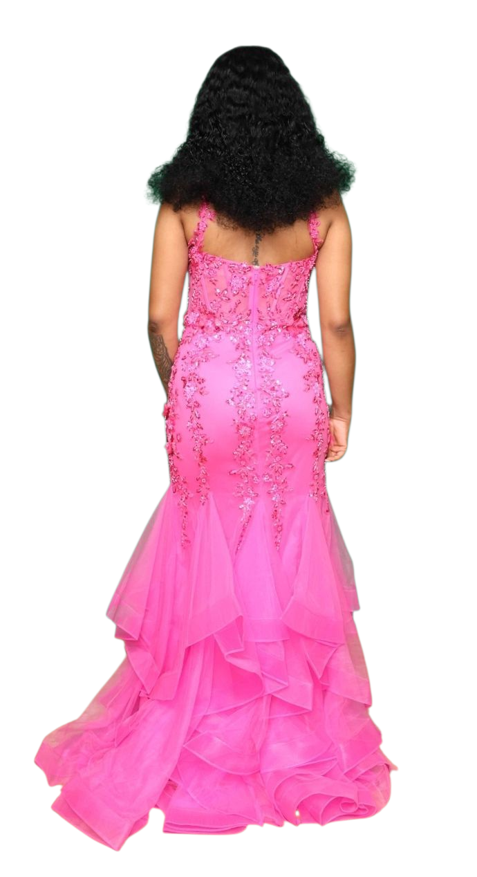 Make a statement in our mesmerizing mermaid gown tailored for the young and fabulous. The structured fitted bodice is a work of art, adorned with whimsical embellished lace appliqué that adds a touch of romance to your look. Appliquéd straps delicately frame your shoulders, striking the perfect balance between elegance and modern flair. The full-layered trumpet skirt cascades gracefully, creating a dramatic silhouette that's both chic and playful. Dance the night away with confidence, as a tasteful leg slit adds a touch of flirtation to this show-stopping ensemble. This gown is more than a dress; it's a celebration of your youthful spirit and vibrant charm. Embrace the spotlight and let your confidence shine in this stunning creation that's as unique and fabulous as you are.